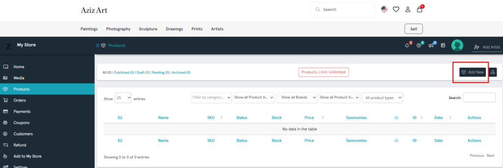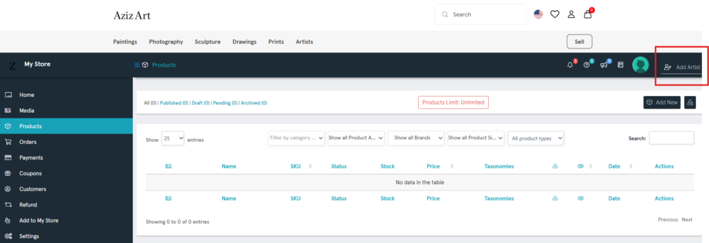 On the Products page, click Add Artist.
