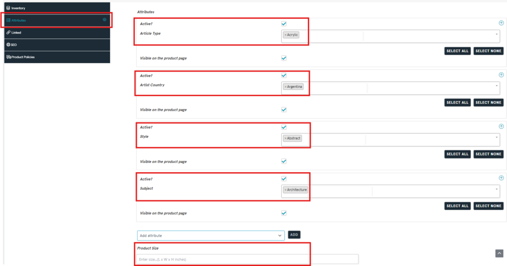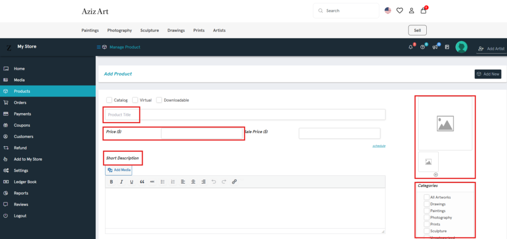 On the Add Product page, only enter artwork information in the red boxes below.